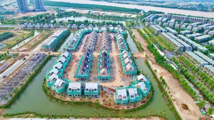 • San lấp và tạo hình mặt nước: Hệ thống kênh rạch bao quanh các đảo nhỏ đã hoàn thành việc tạo hình. Làn nước trong xanh bắt đầu được dẫn vào, tạo nên địa thế “minh đường tụ thủy” cho từng căn biệt thự.